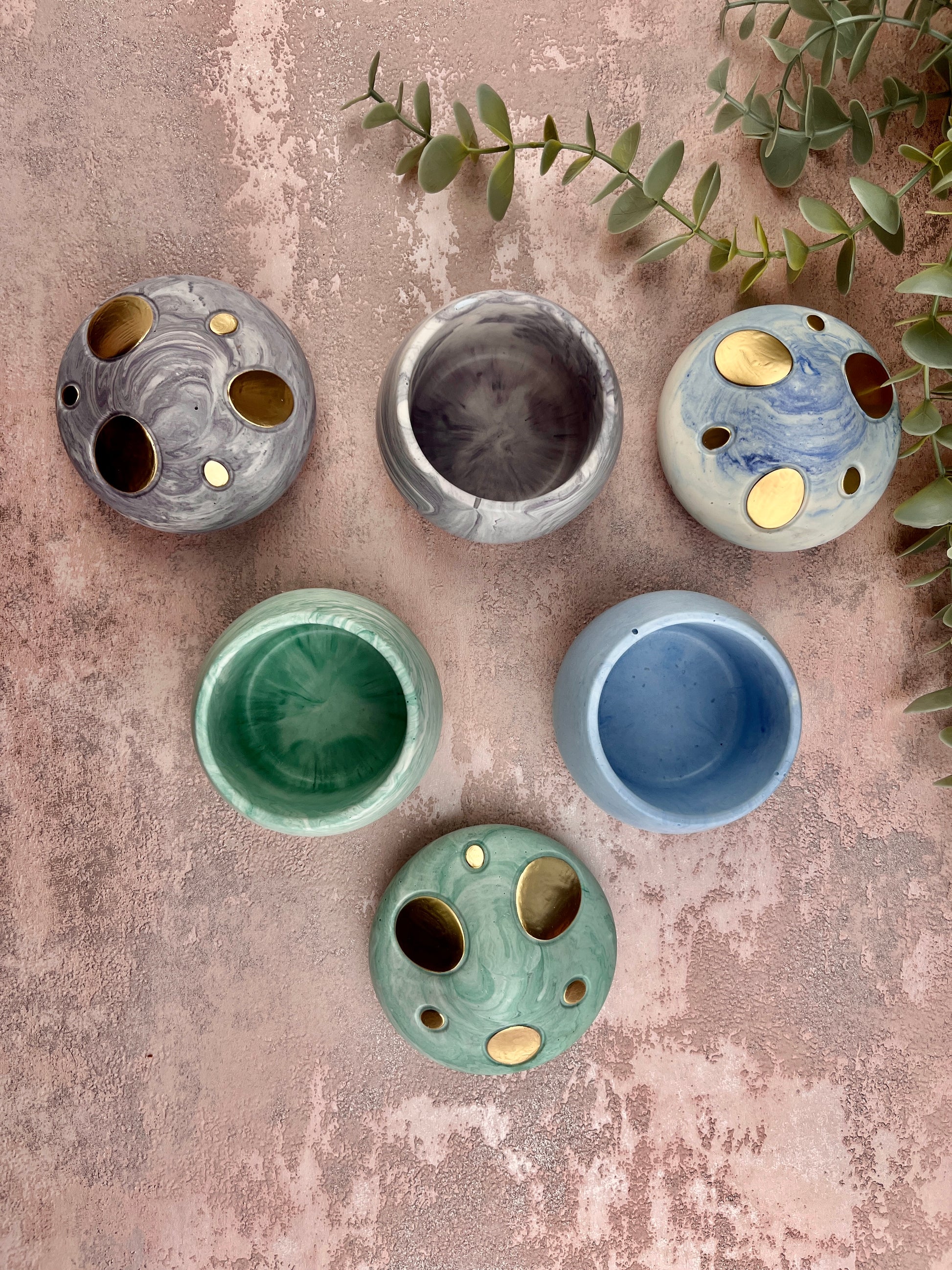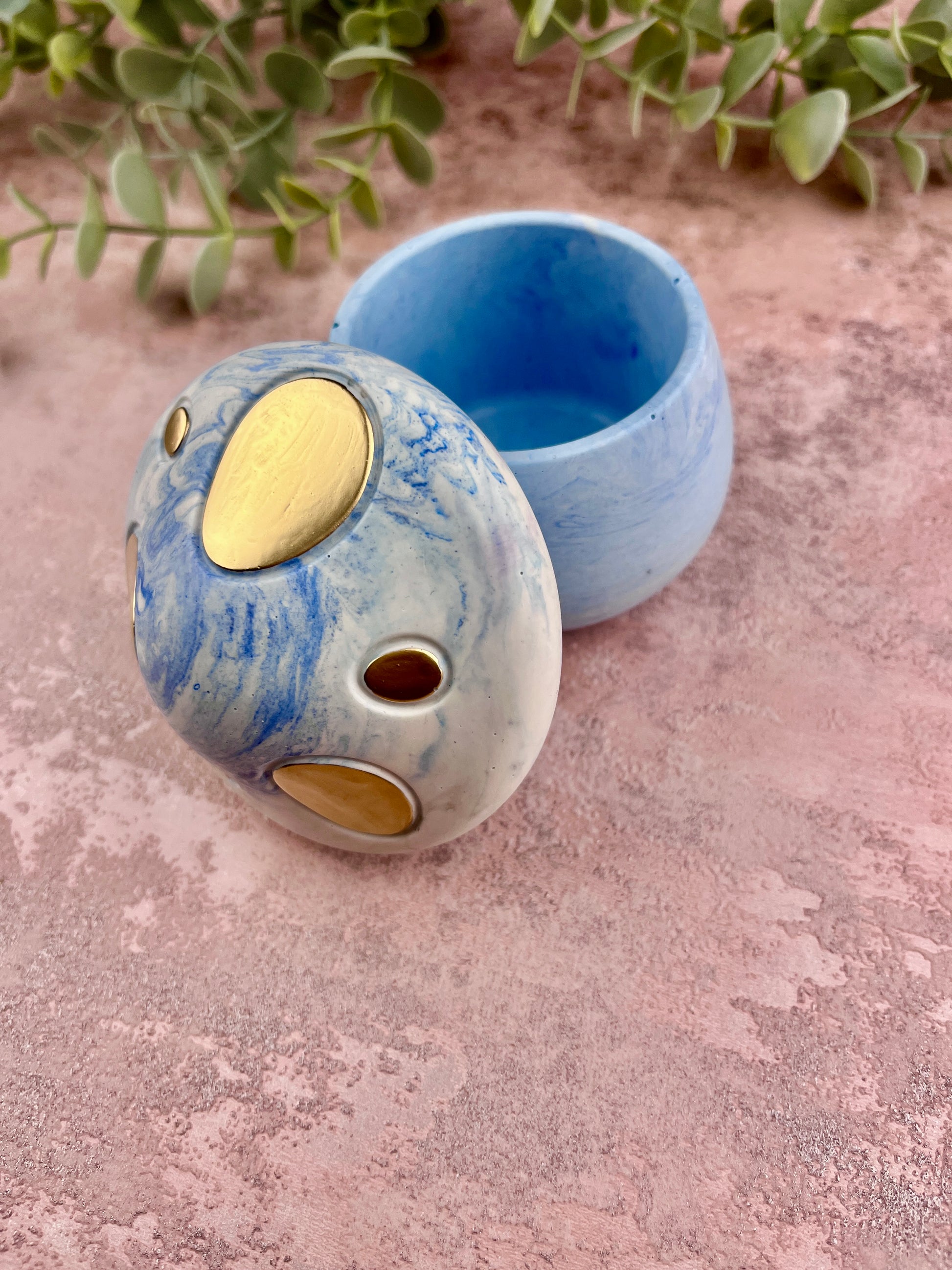 Each of our jesmonite items are made by us and carefully crafted for you. Each one may differ slightly from photos due to the handcrafted nature of jesmonite. We do try our best to remove bubbles from the surface of our products but sometimes this is not always possible so the surface texture may vary. Due to the marbling process each trinket box turns out slightly different than the last, if you would like to see your box prior to postage please email us and we will try to send you a photo of your product.