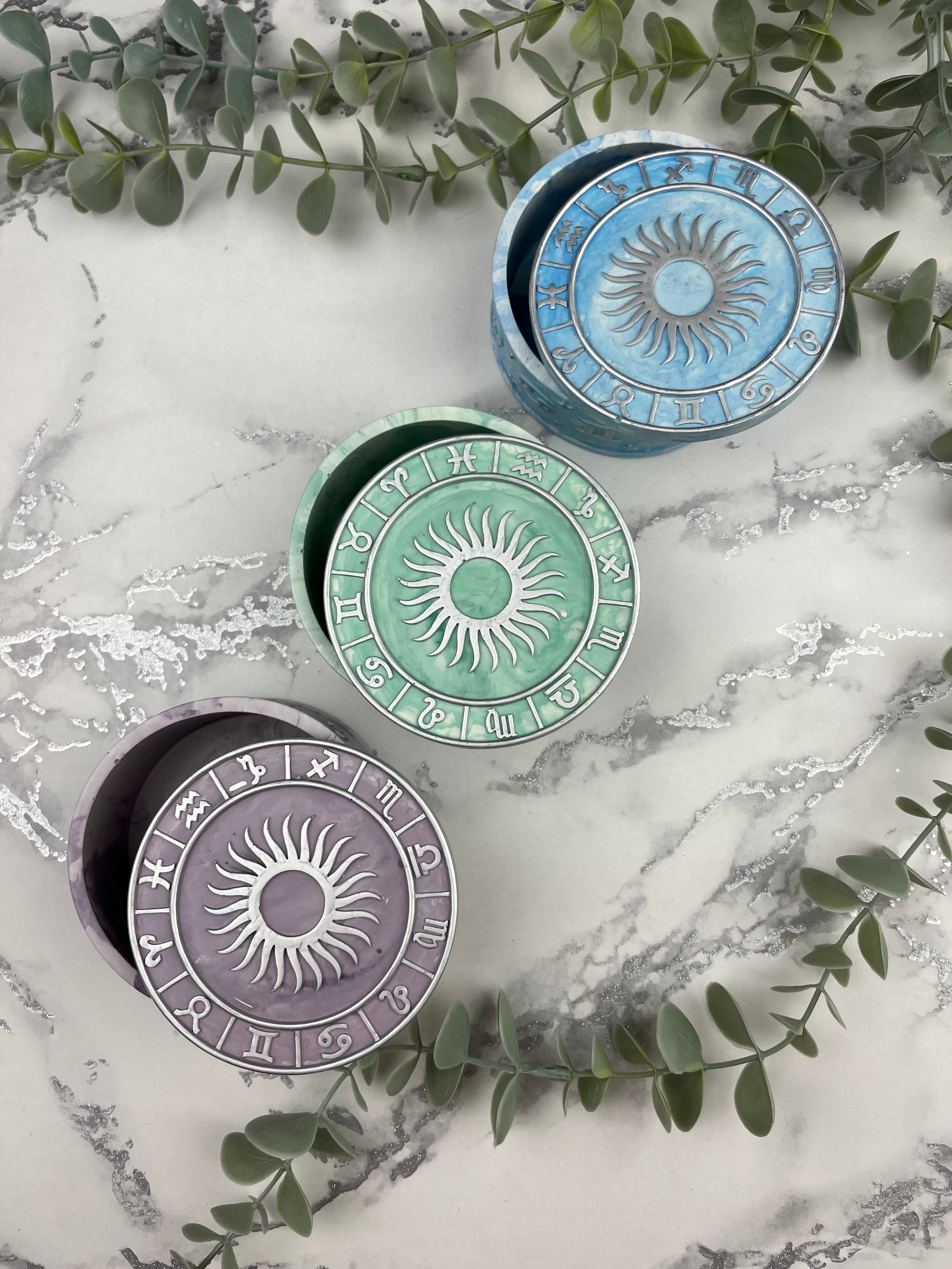 These astrology boxes are the perfect gift for people obsessed with the zodiac signs. Each box features all the star signs and either gold or silver hand painted details. These cute little trinket boxes are the perfect decor for your vanity to store your jewellery or your makeup sponges in to protect them from dust. They are also great for storing wax melts as the fragrance soaks into the Jesmonite. So each time your open your box you will be greeted with your favourite home fragrance scents.