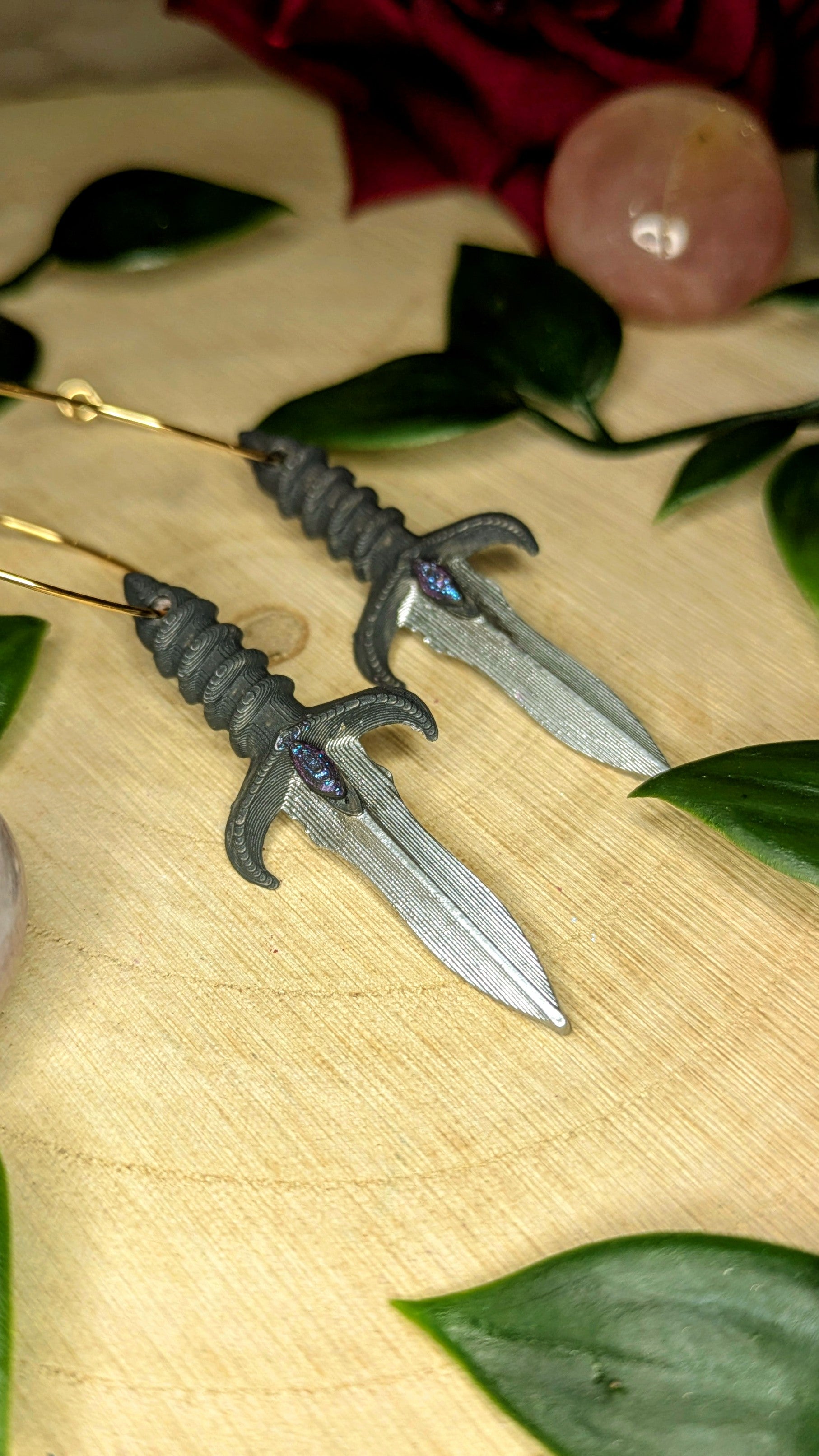 These cute little daggers are entirely handmade via 3D modelling, 3D printing and then hand painted. There may be slight colour discrepancies between your screen and your jewellery.