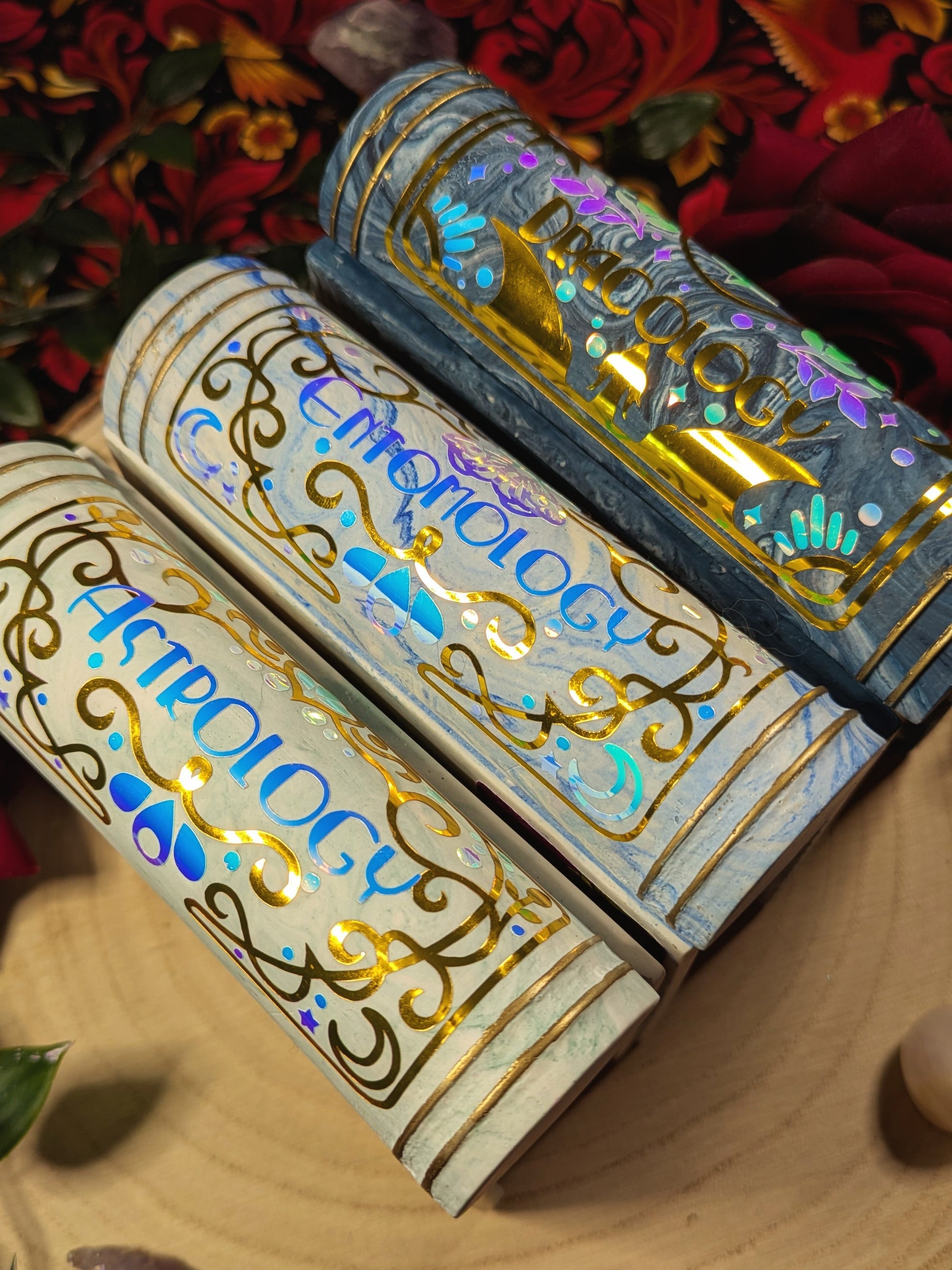 This enchanting book-shaped trinket box will bring a magical touch to your home. They are based on the Schools of Arcana and so far we have released 2 of these, the School of Illusion and the School of Divination. These boxes are velvet lined to protect your more precious items and ensure they remain safe. They're perfect for jewellery, dice and all your favourite small trinkets. They can also be used as book ends as they have a nice weight to them and storing them this way you'll still be able to access your trinkets.
