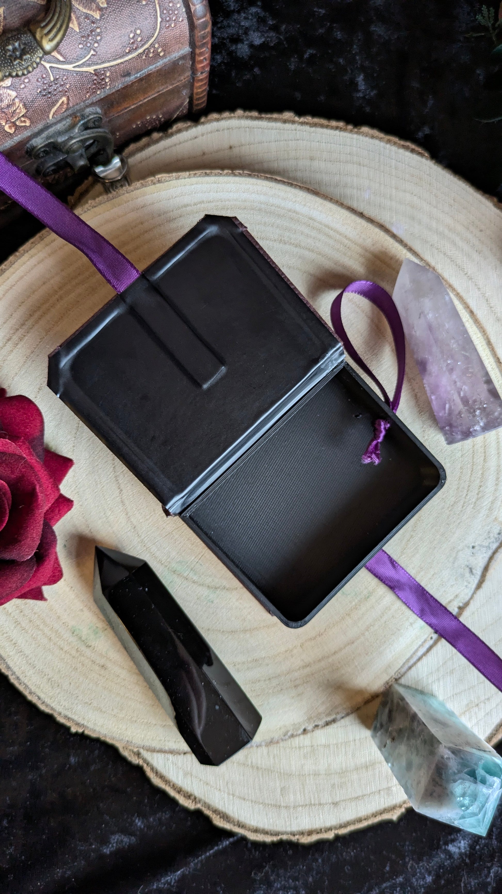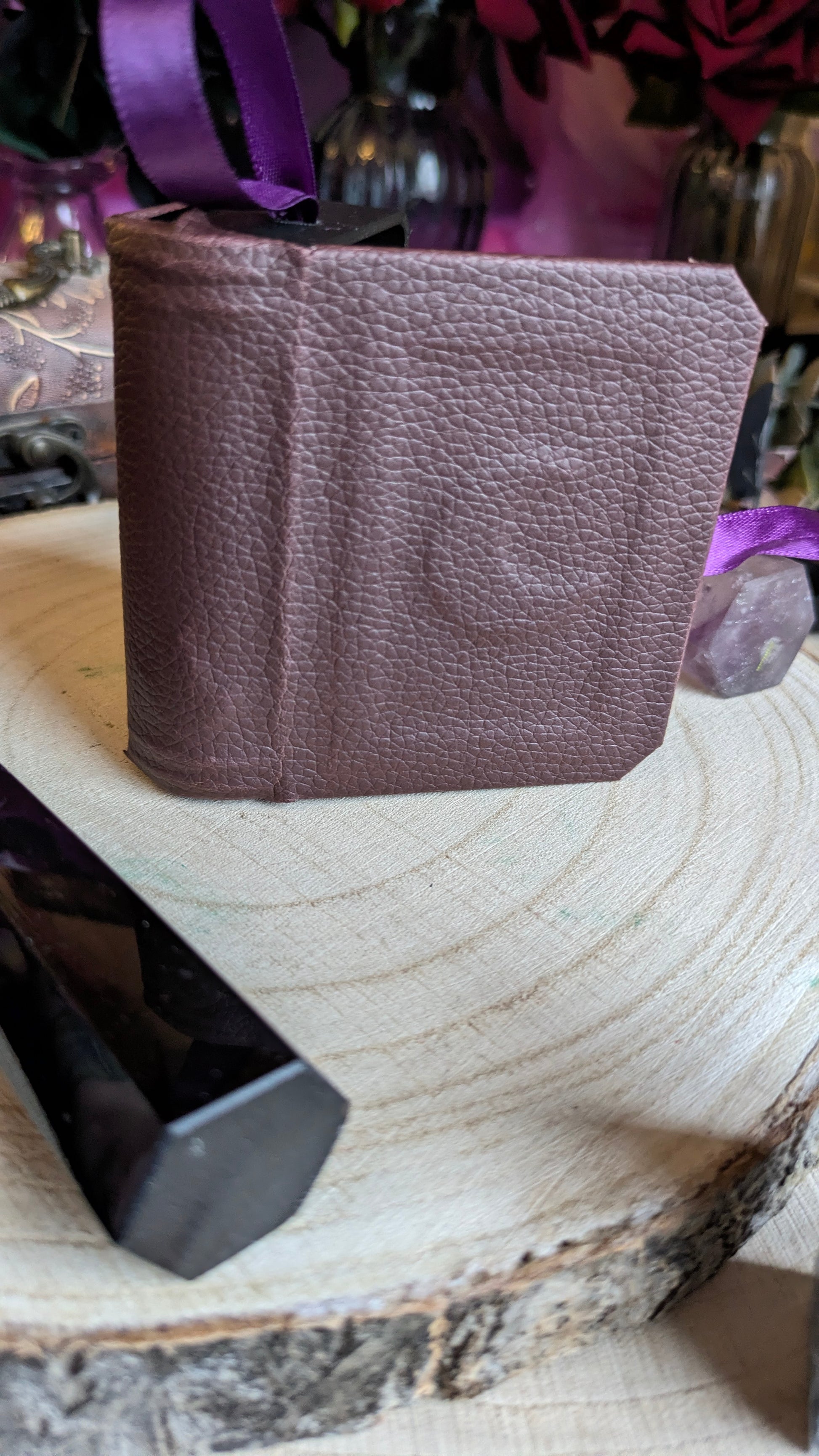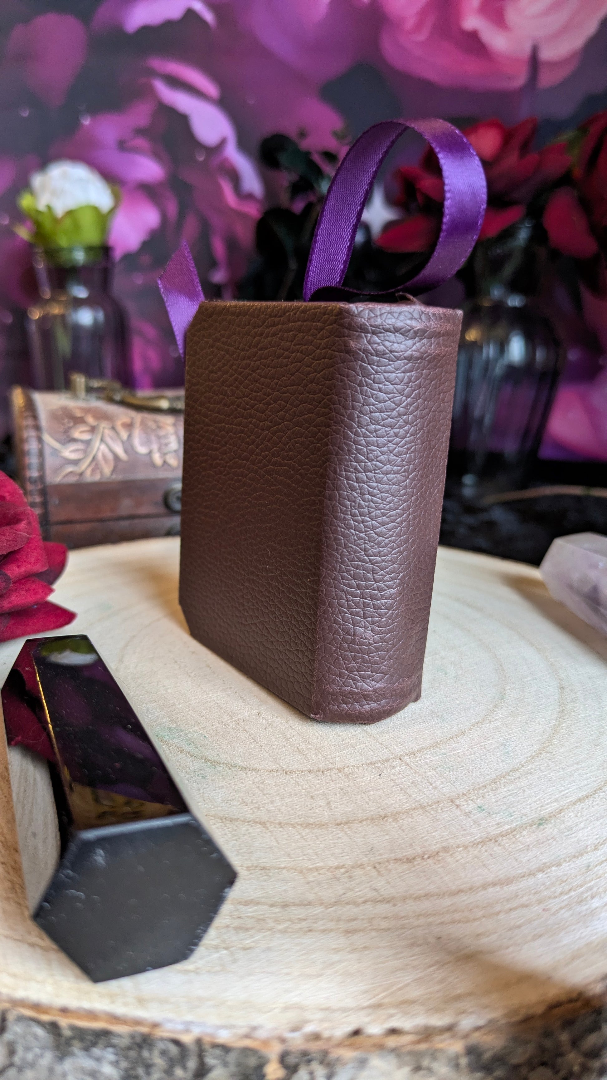 These are hand bound using faux leather & satin ribbon to hang & tie closed, the middle is 3D modelled & printed to keep these little ornaments super lightweight.