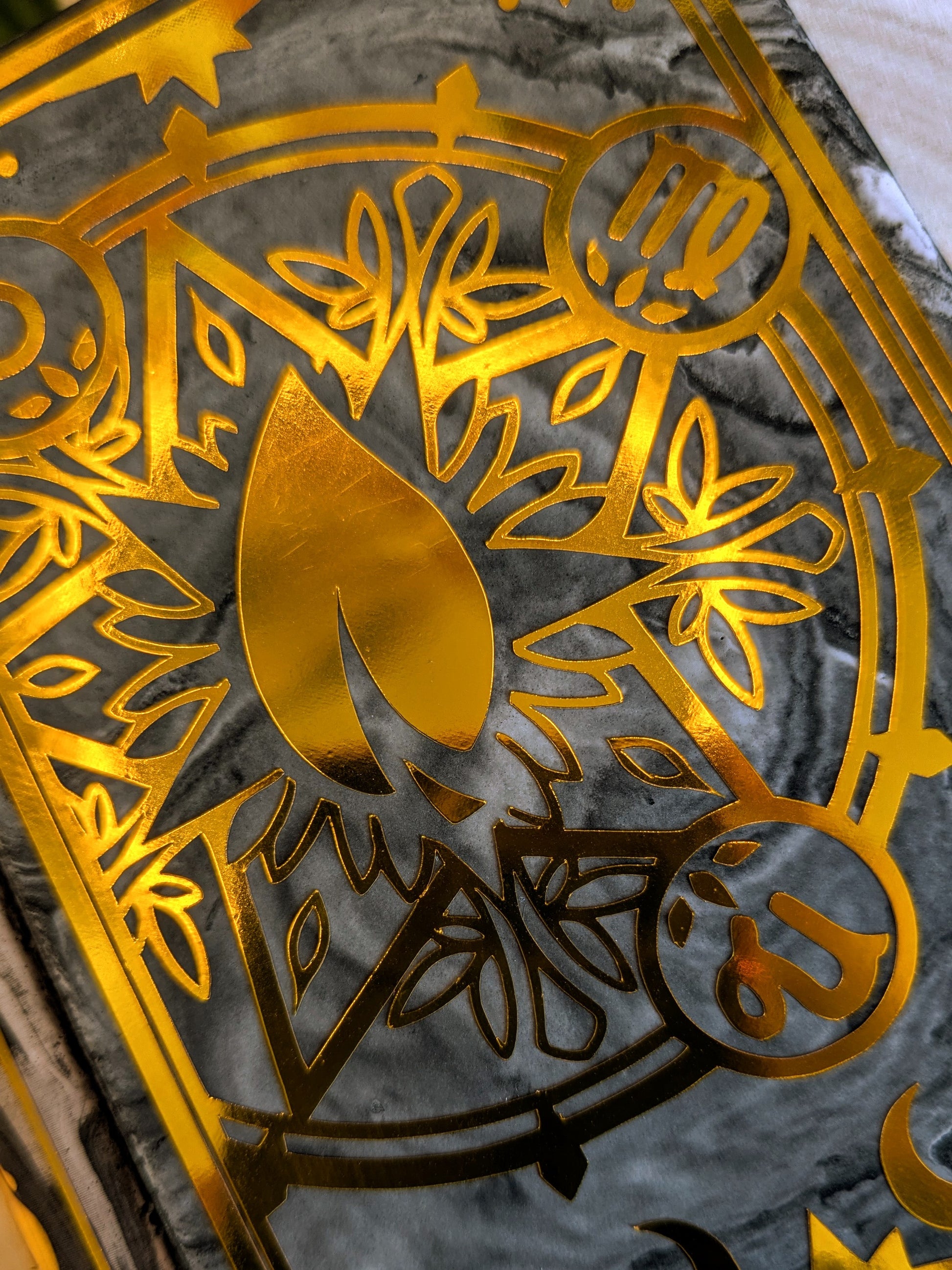 Signs Taurus, Virgo & Capricorn will automatically be in House Terra unless you can wield multiple elements. The Front of this piece features all the Earth signs and my imagining of the symbol for Terra. The back features what I imagine the daily horoscope screen looks like on the Atlas.