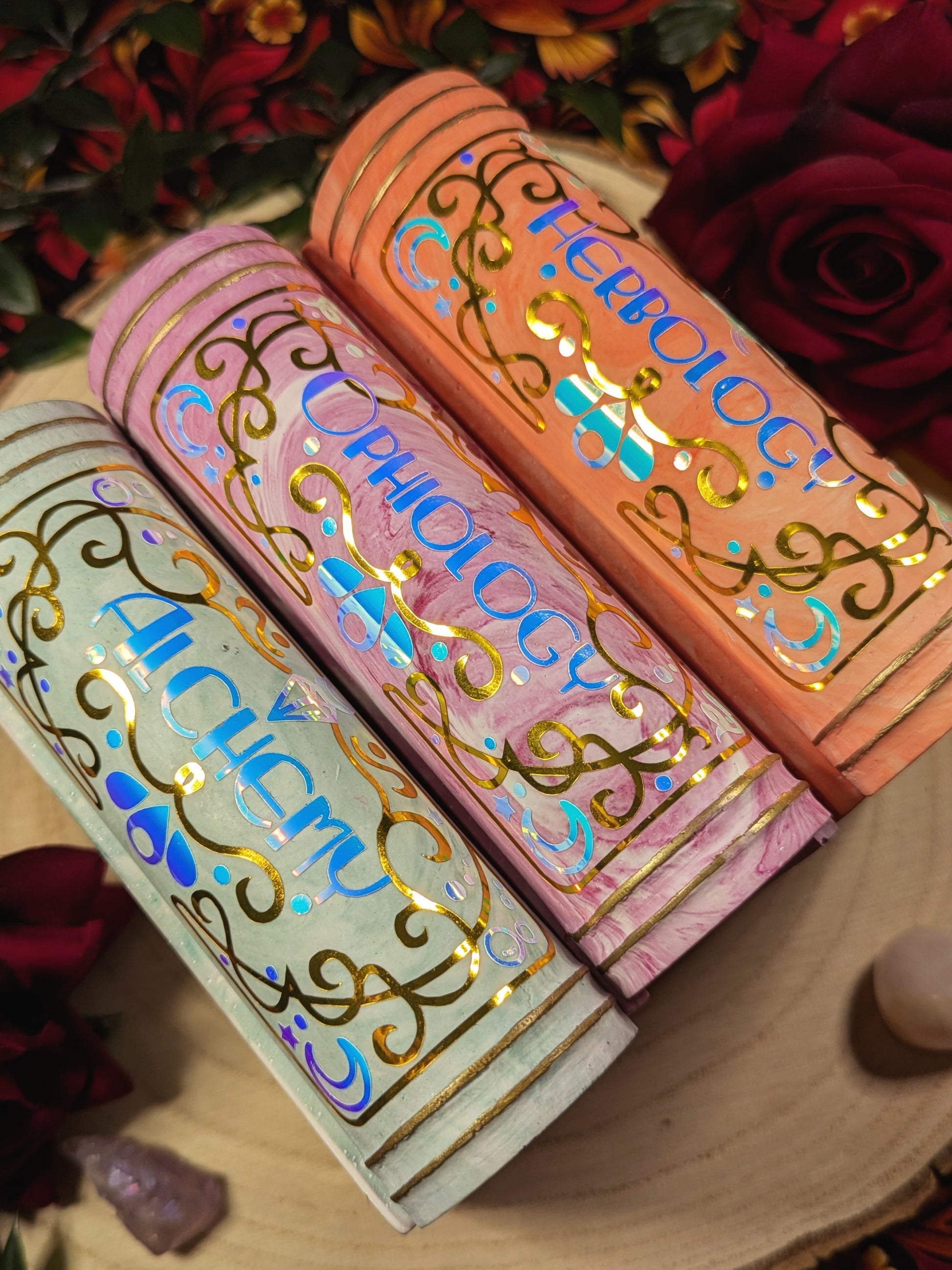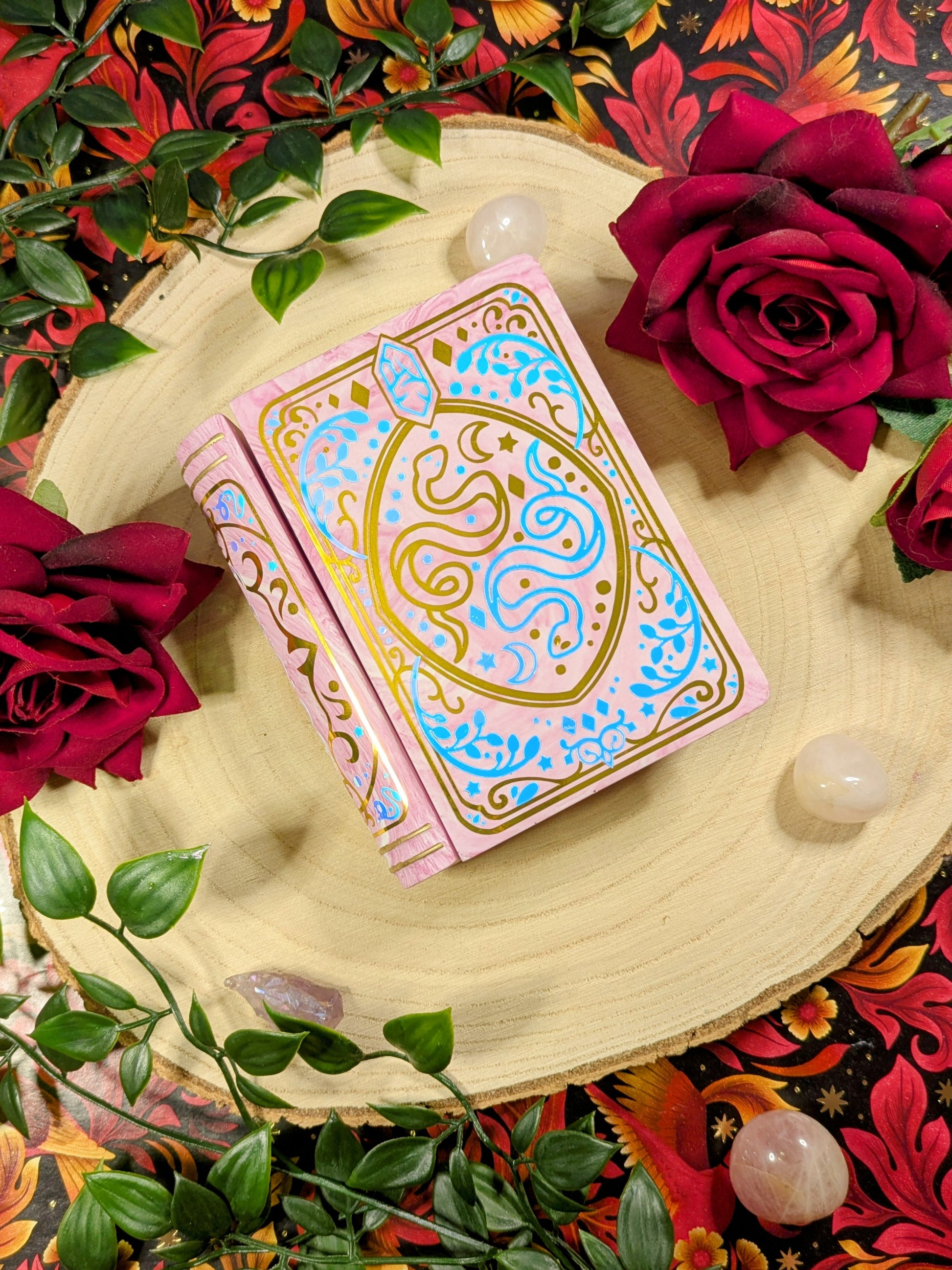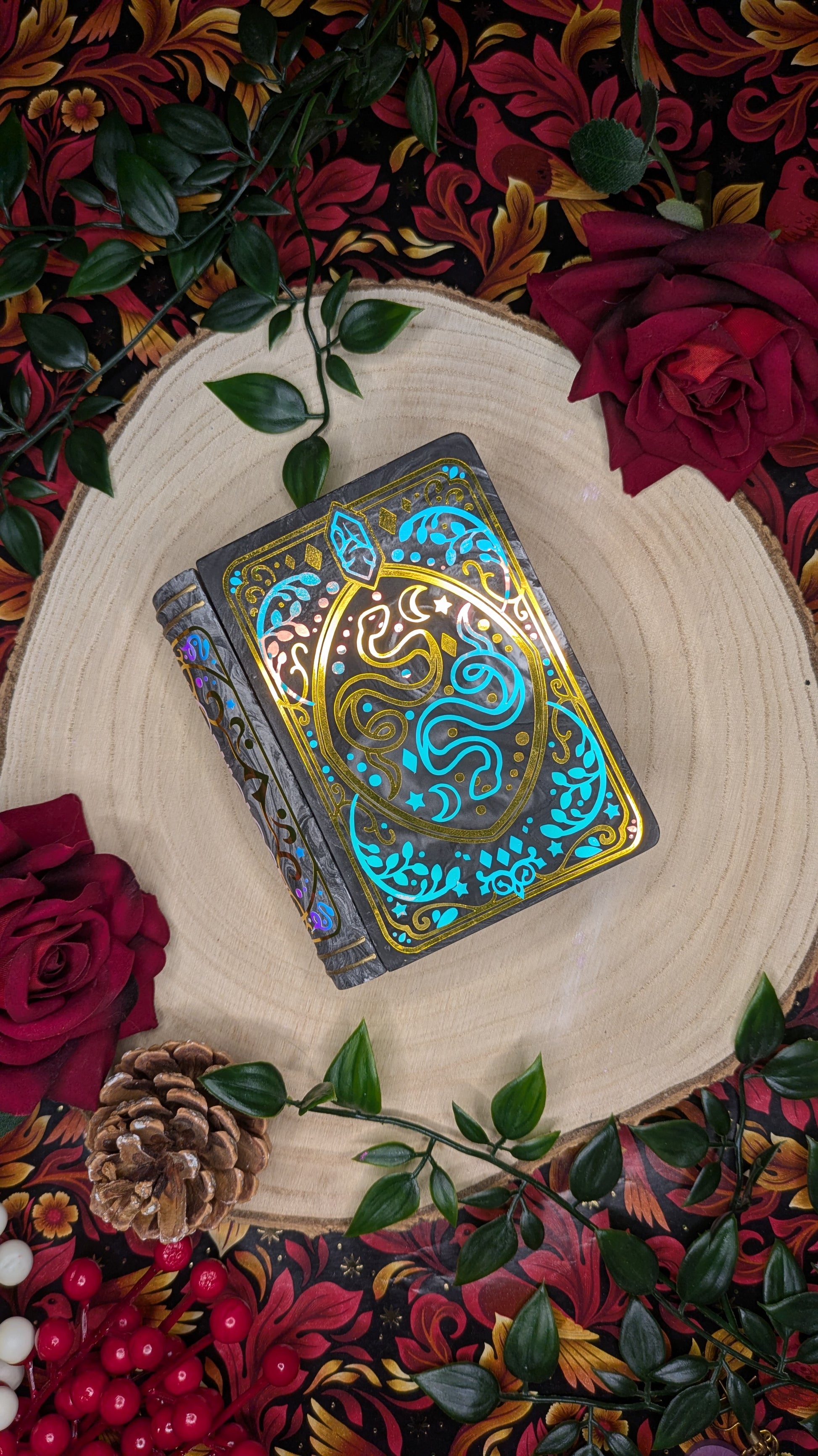 These book shaped jewellery boxes are the most enchanting little pieces of decor for any room. They have been designed so they can be displayed any way you like, stood on their end, laid down on your vanity and even stacked on top of each other, you will always be able to access the contents due to the way the drawer opens. This book design is all about the serpents, Ophiology is the branch of zoology that deals with snakes. These books are velvet lined to protect your more precious items and ensure they remain safe. They can also be used as book ends as they have a nice weight to them and storing them this way you'll still be able to access your trinkets.