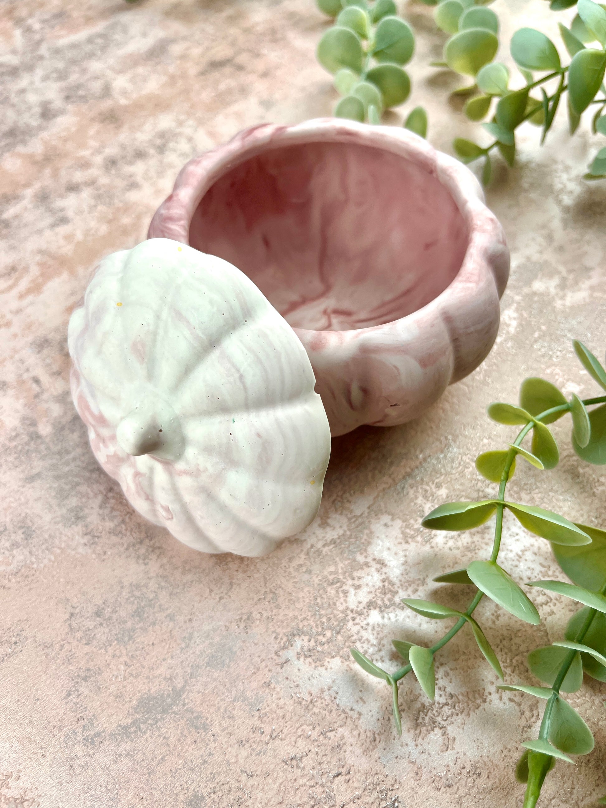 Each of our jesmonite items are made by us and carefully crafted for you. Each one may differ slightly from photos due to the handcrafted nature of jesmonite. We do try our best to remove bubbles from the surface of our products but sometimes this is not always possible so the surface texture may vary. Due to the marbling process each trinket box turns out slightly different than the last, if you would like to see your box prior to postage please email us and we will try to send you a photo of your product.