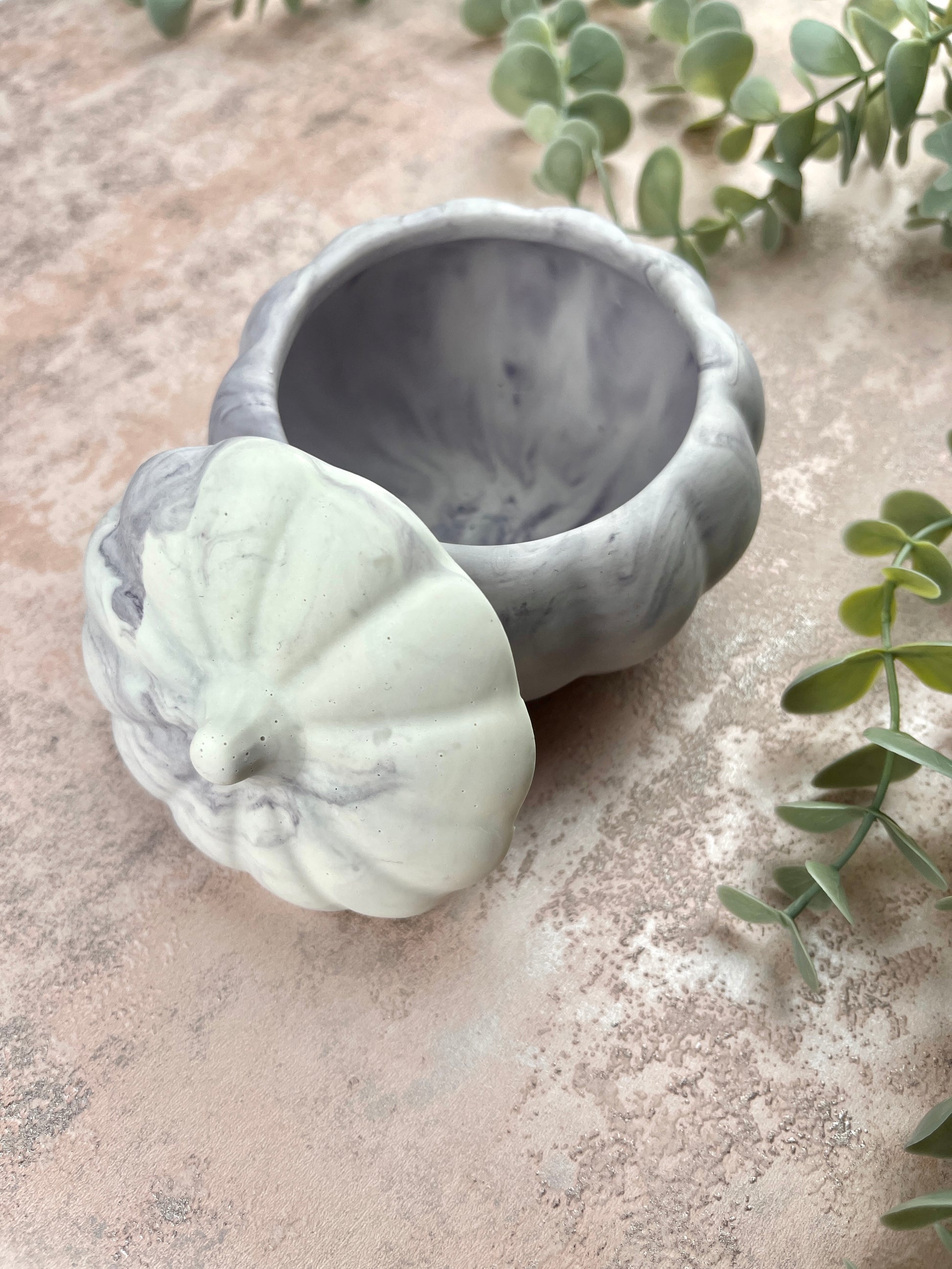 Each of our jesmonite items are made by us and carefully crafted for you. Each one may differ slightly from photos due to the handcrafted nature of jesmonite. We do try our best to remove bubbles from the surface of our products but sometimes this is not always possible so the surface texture may vary. Due to the marbling process each trinket box turns out slightly different than the last, if you would like to see your box prior to postage please email us and we will try to send you a photo of your product.
