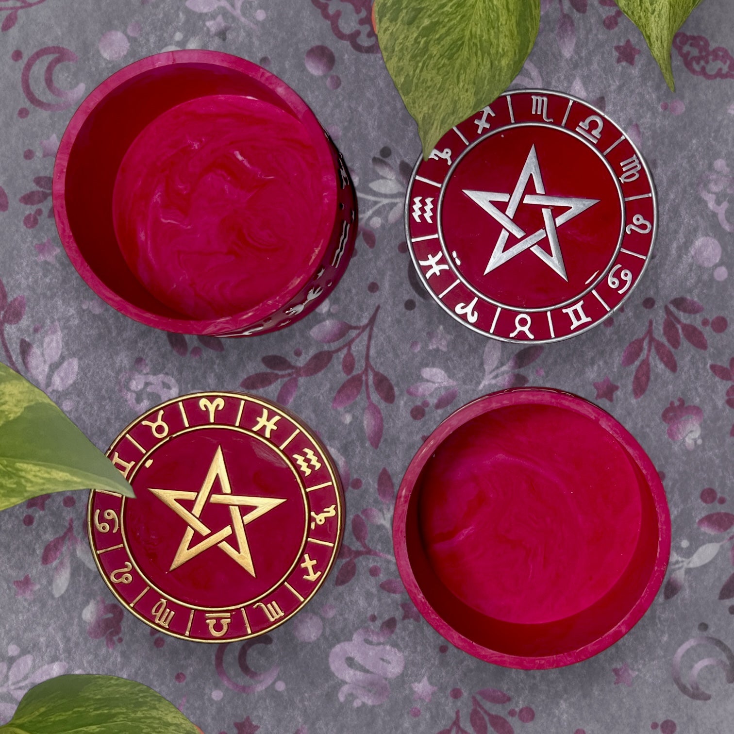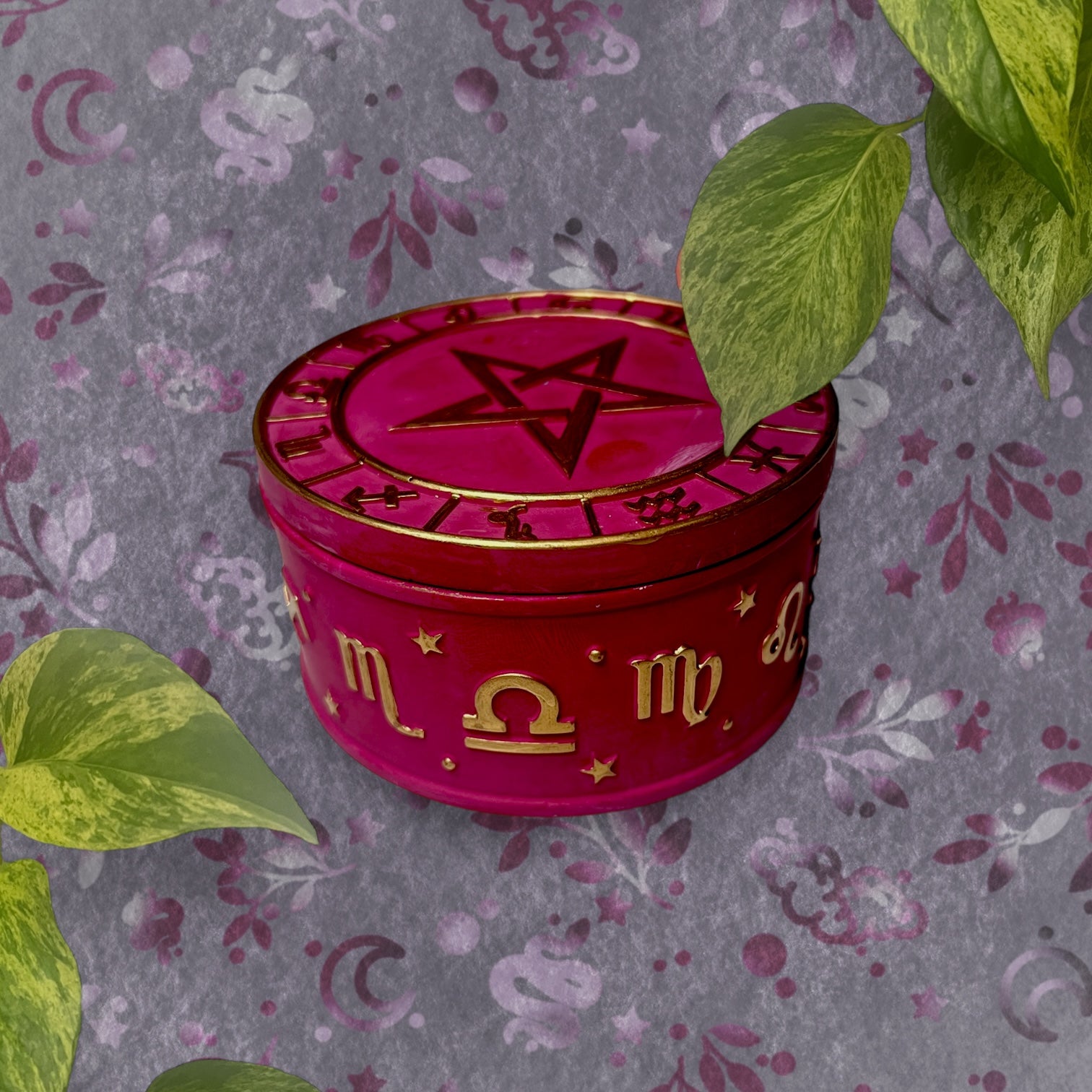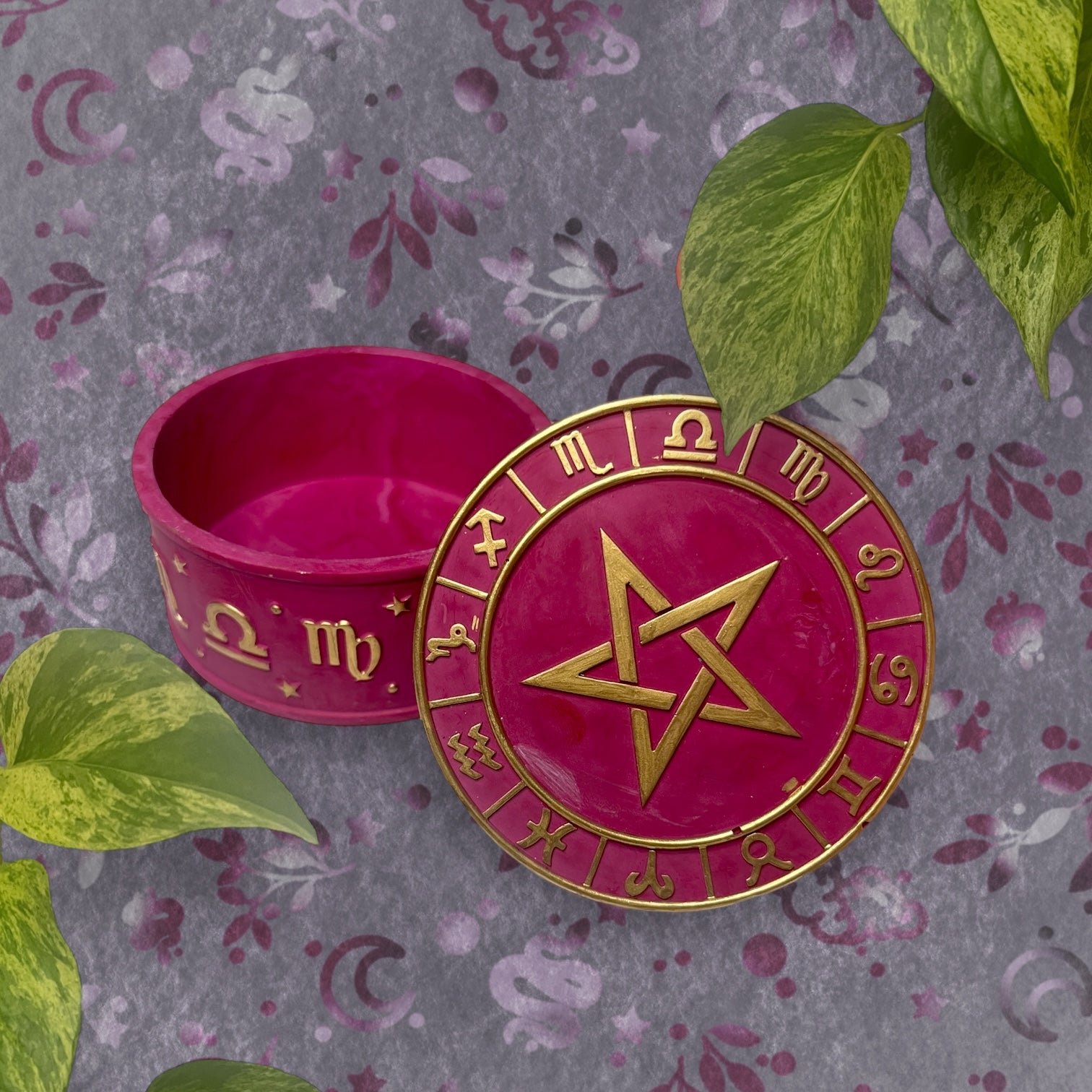 This intricately detailed trinket box is perfect for storing small items. Crafted from a durable and lightweight material, it features a star and horoscope detailing to add a touch of originality. With a unique and beautiful design, this trinket box is an excellent choice for jewelry storage.