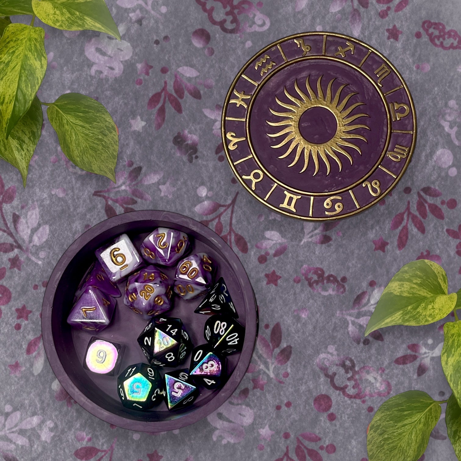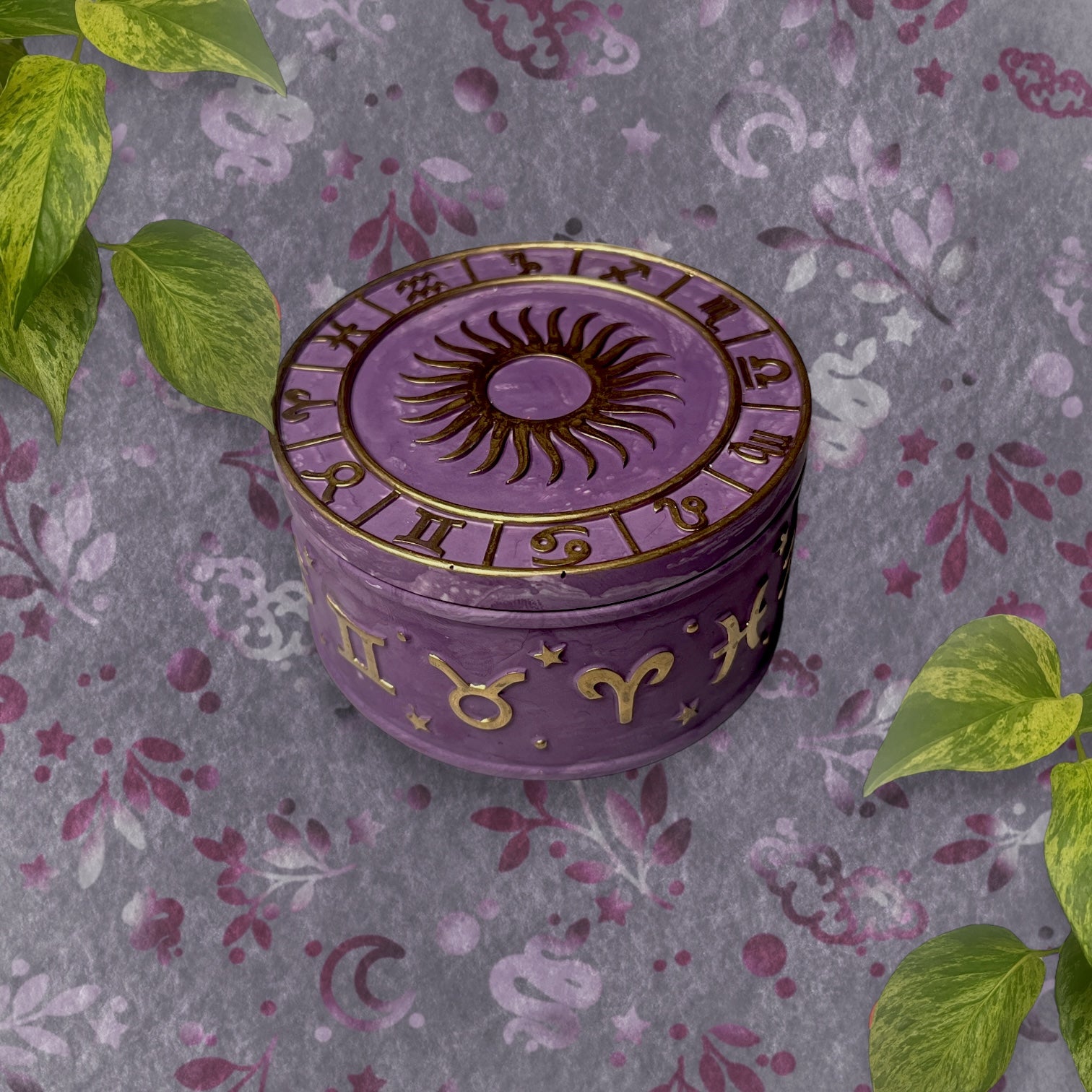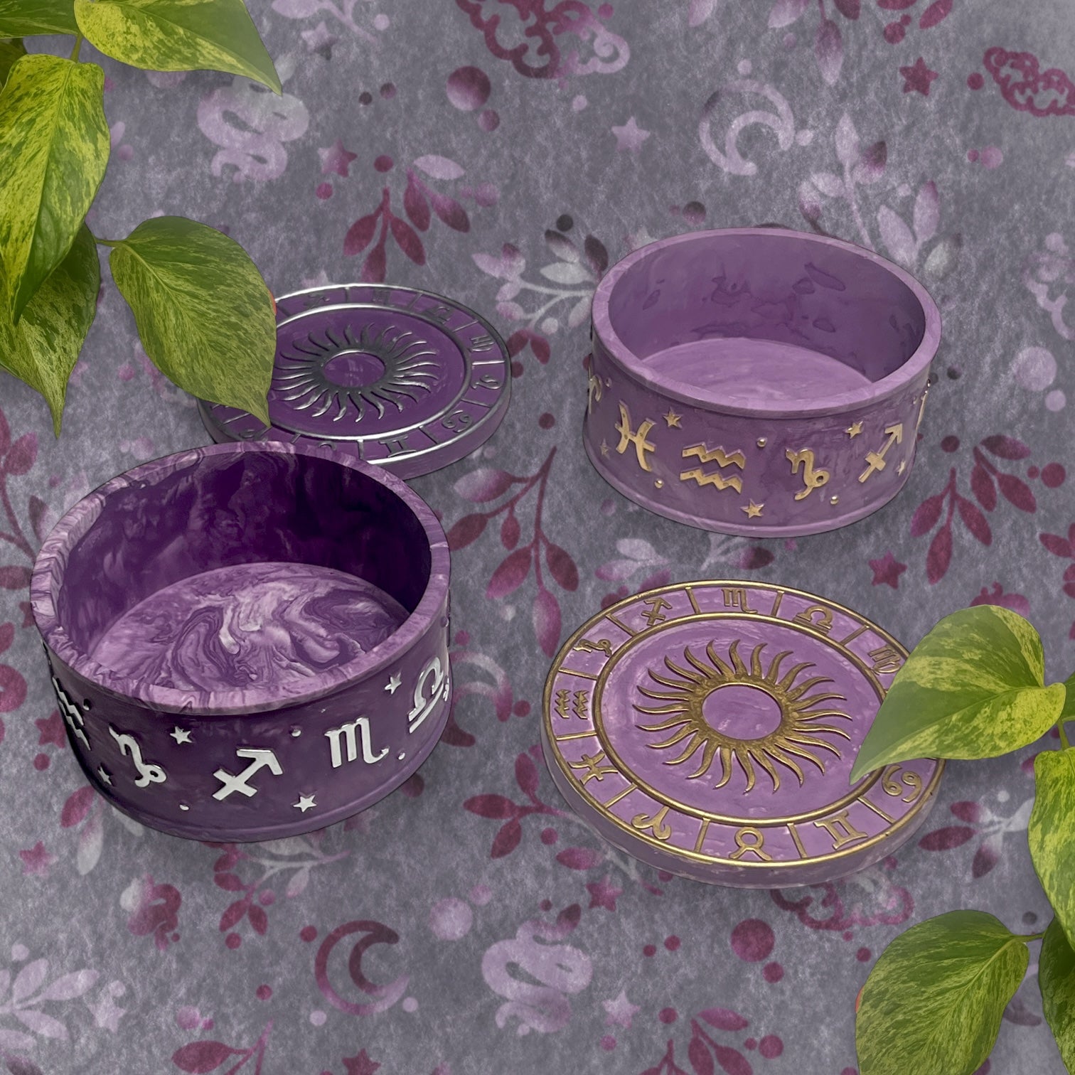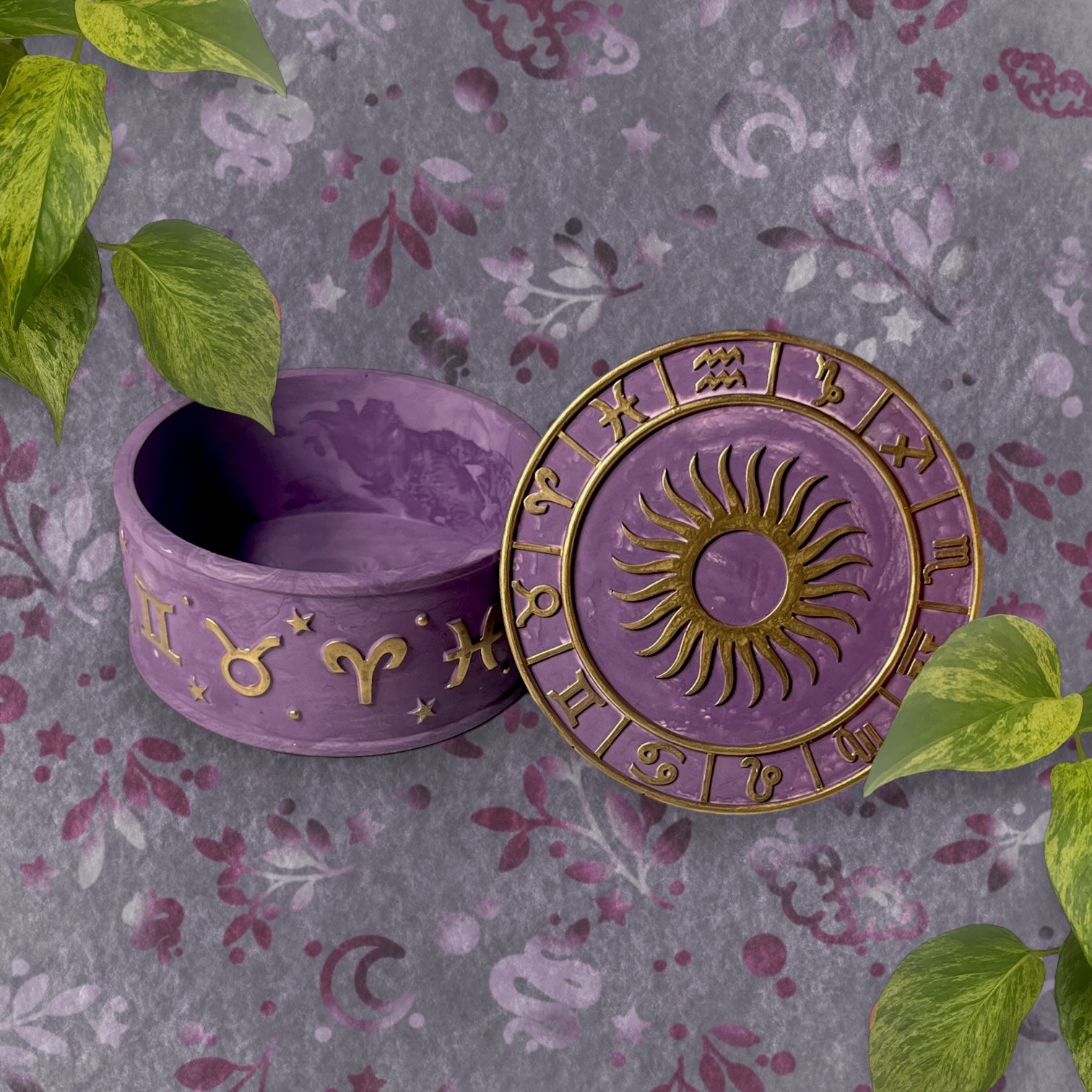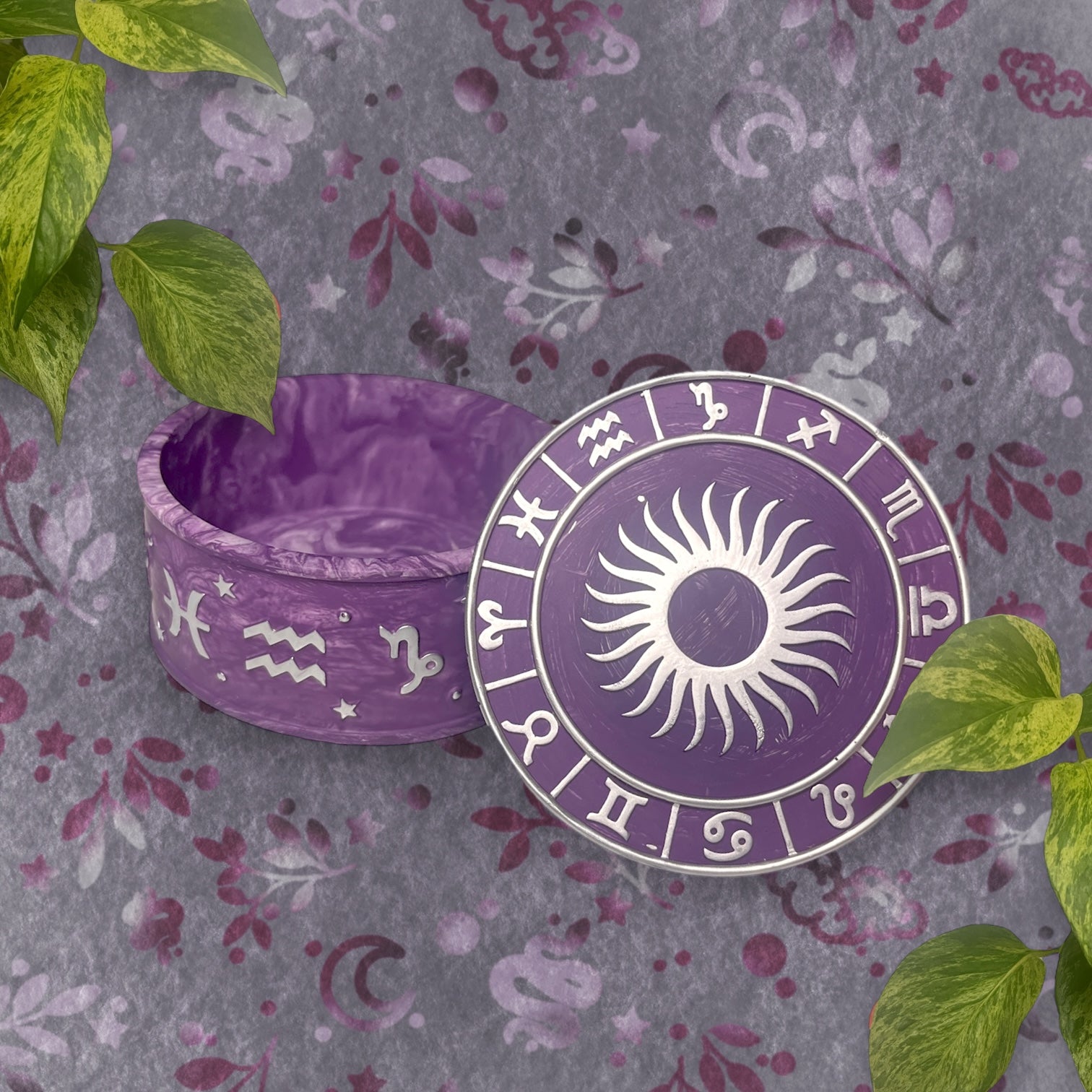 This intricately detailed trinket box is perfect for storing small items. Crafted from a durable and lightweight material, it features a star and horoscope detailing to add a touch of originality. With a unique and beautiful design, this trinket box is an excellent choice for jewelry storage.
