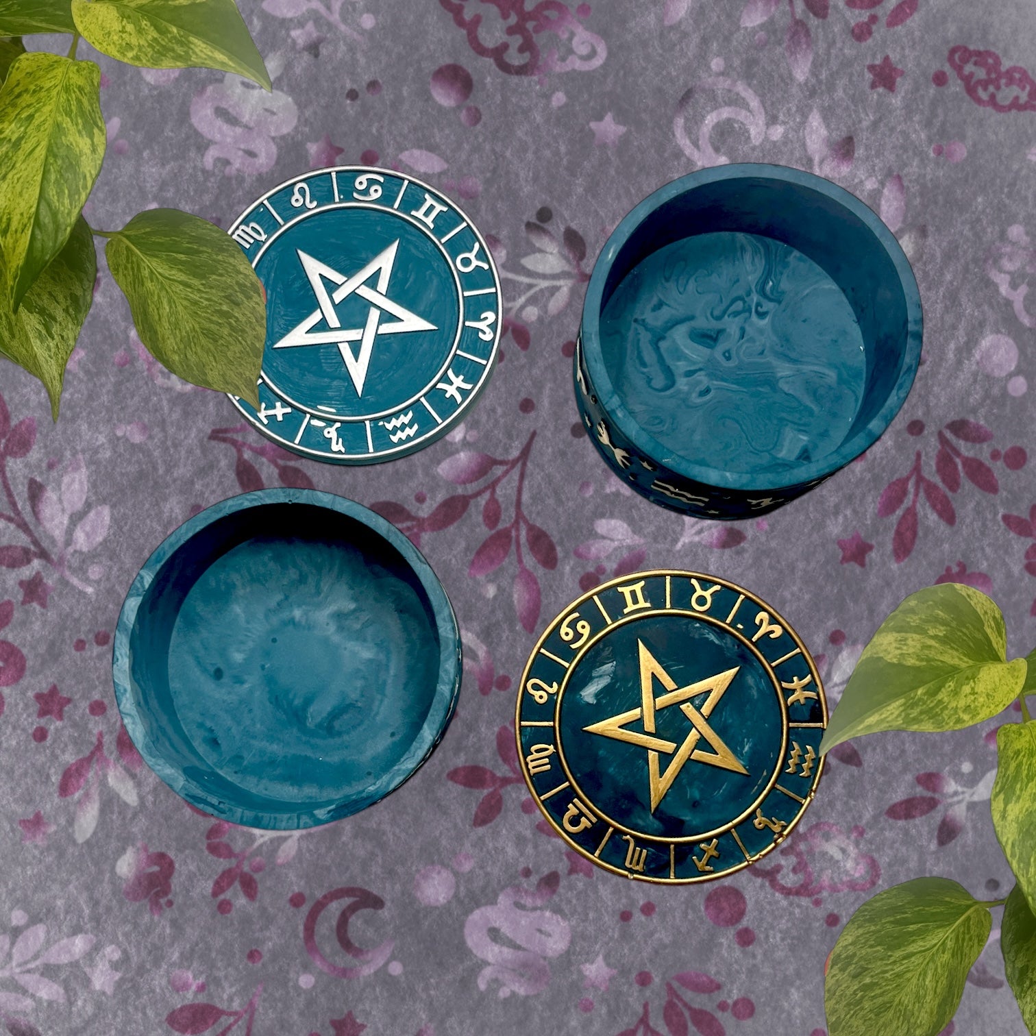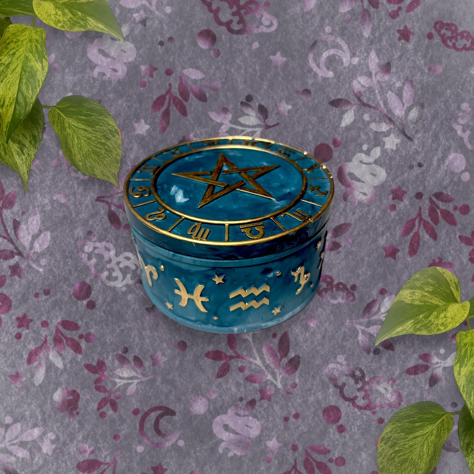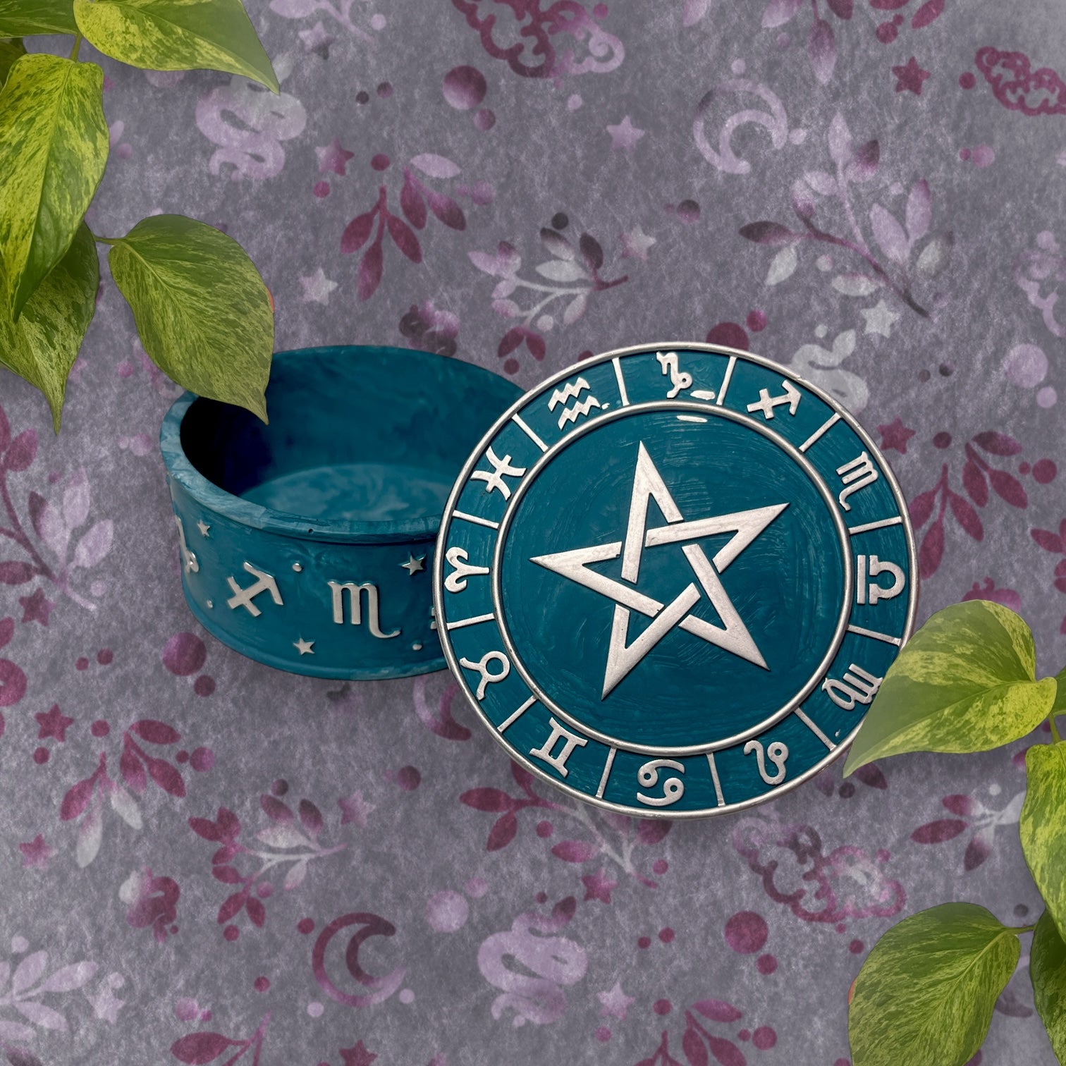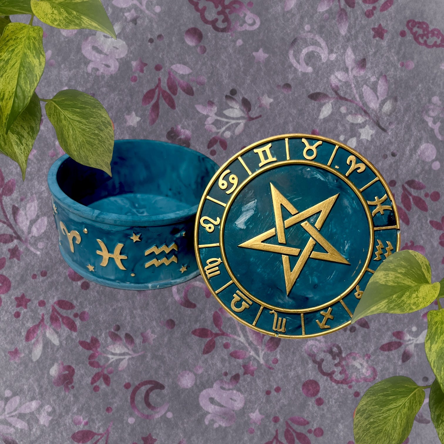 This intricately detailed trinket box is perfect for storing small items. Crafted from a durable and lightweight material, it features a star and horoscope detailing to add a touch of originality. With a unique and beautiful design, this trinket box is an excellent choice for jewelry storage.